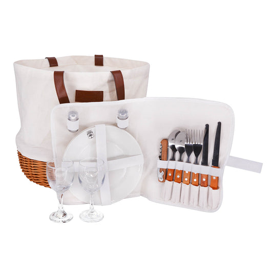 Picknickkörbe aus natürlicher Weide und Rucksäcke, die mit allen Picknickutensilien (Geschirr, Gläser, Besteck...) für 2, 4 oder 6 Personen verkauft werden. Die meisten unserer Körbe verfügen über ein Kühlfa