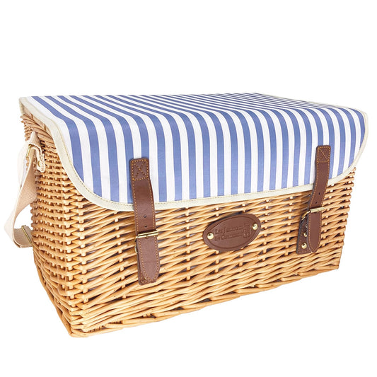 ● Ein Picknickkorb mit passender Decke: Das Modell Marine ist ein besonders schicker Picknickkorb für 4 Personen mit seinen blauen Riemen und der weiß patinierten natürlichen Weide. Dieser Korb wird mit einer Decke aus passendem Stoff geliefert, die das ideale Format für 4 Personen und mehr hat.
