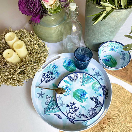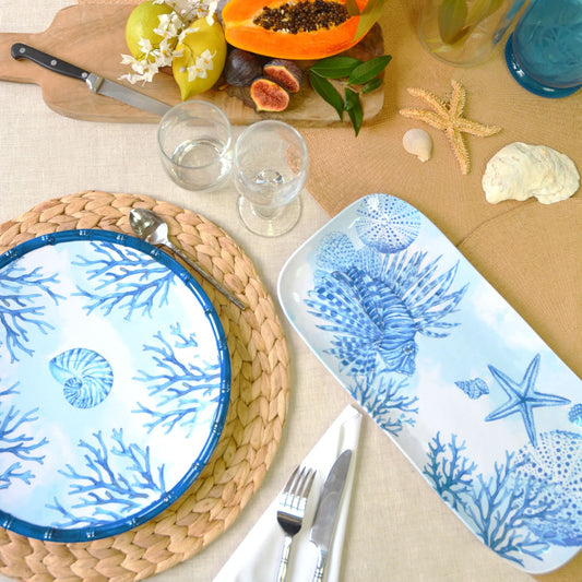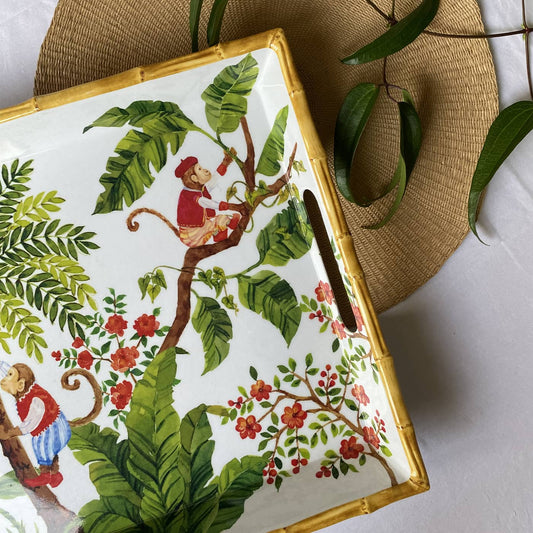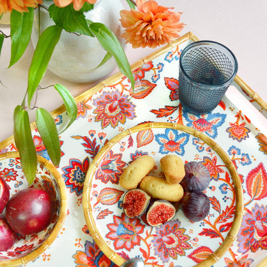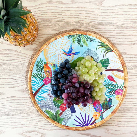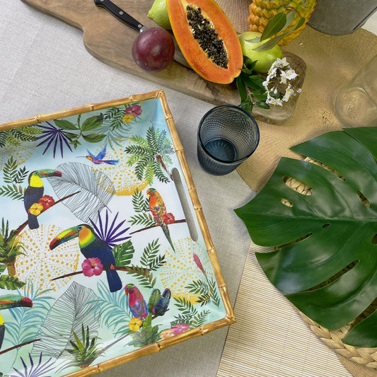 Serviertablett, rechteckiges Tablett, runde Platte, Kuchenplatte... Entdecken Sie eine Auswahl an Tabletts und Schüsseln, die mit originellen und farbenfrohen Motiven verziert sind, für ein komplettes Tischservice voller Pep! Bringen Sie Licht auf Ihre Tische mit unseren verschiedenen Geschirrkollektionen aus Melamin :Tukane aus Rio, Dschungel, Affen aus Bali, Lissabon, Exotische Blumen...