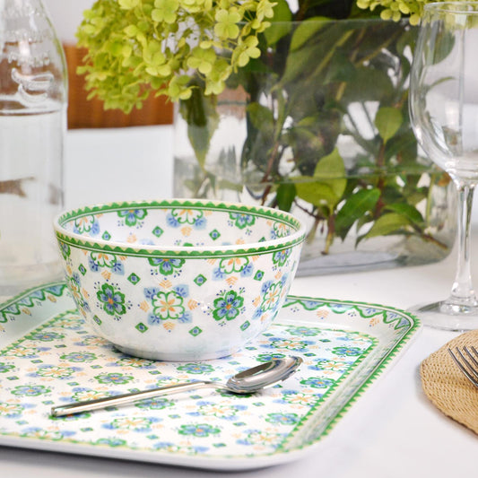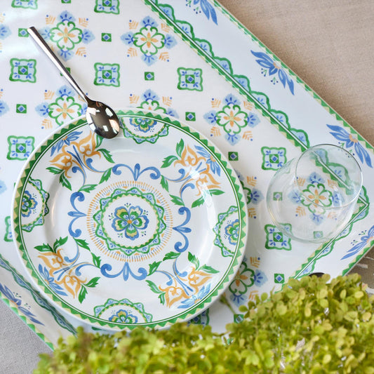 Serviertablett, rechteckiges Tablett, runde Platte, Kuchenplatte... Entdecken Sie eine Auswahl an Tabletts und Schüsseln, die mit originellen und farbenfrohen Motiven verziert sind, für ein komplettes Tischservice voller Pep! Bringen Sie Licht auf Ihre Tische mit unseren verschiedenen Geschirrkollektionen aus Melamin :Tukane aus Rio, Dschungel, Affen aus Bali, Lissabon, Exotische Blumen...