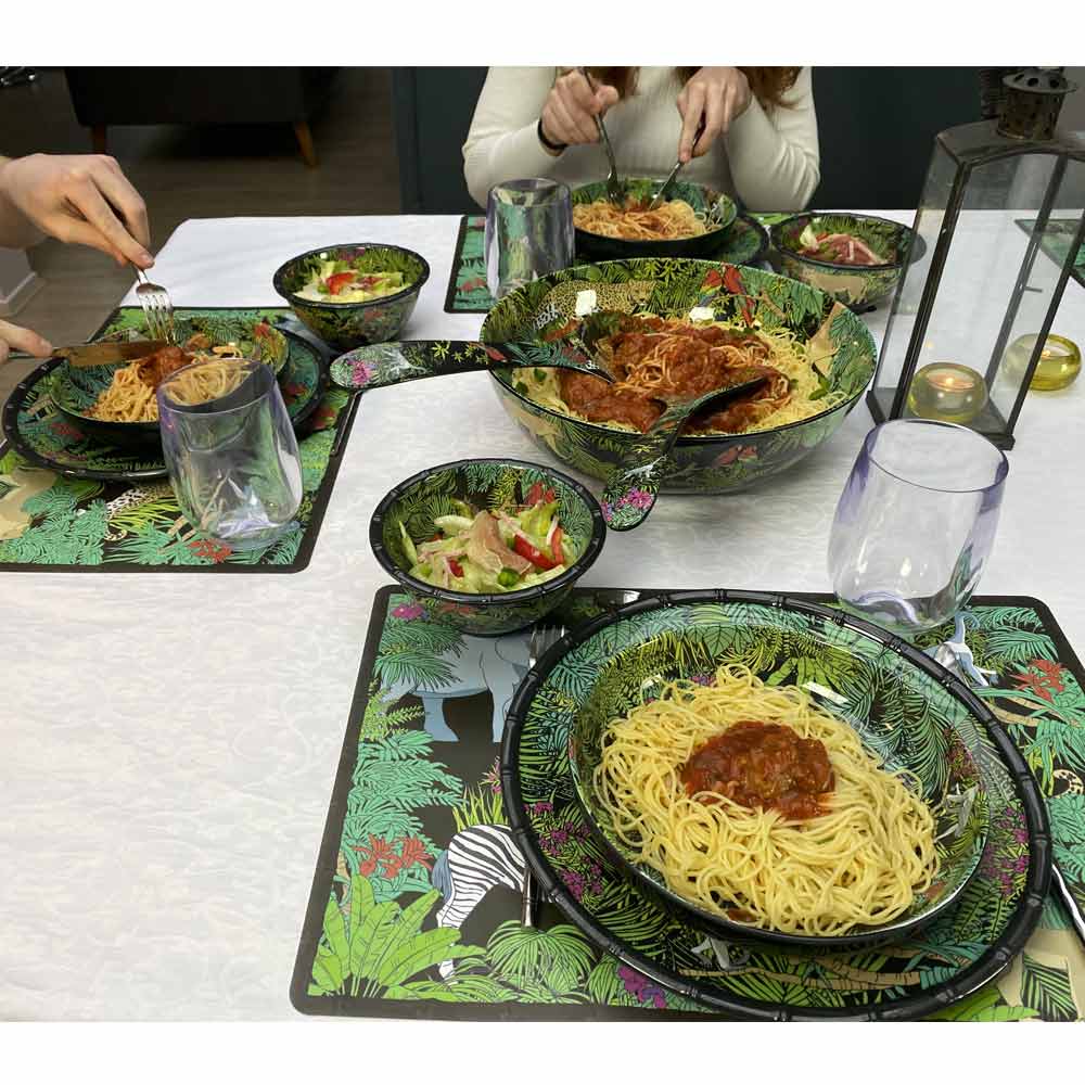 Mit seinen Mustern aus üppigem Dschungel und wilden Tieren wird dieser schöne farbenfrohe Teller Ihre Gerichte und Ihren Tisch perfekt zur Geltung bringen.